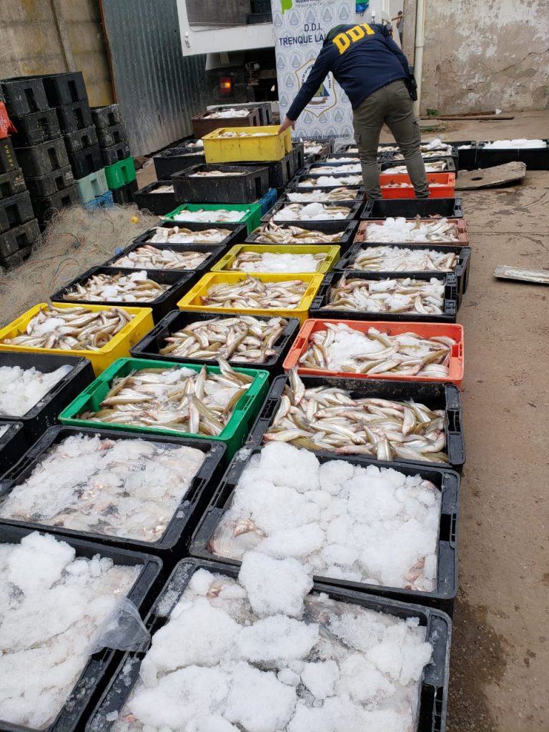 Durante el allanamiento, se encontraron 189 cajones para acopio de pescado, 207 cajones con 7.852 Kg de pescado congelado, 34 bolsas con redes de pesca, balanza grande, freezers, flota de celulares y documentación de interés para la causa.