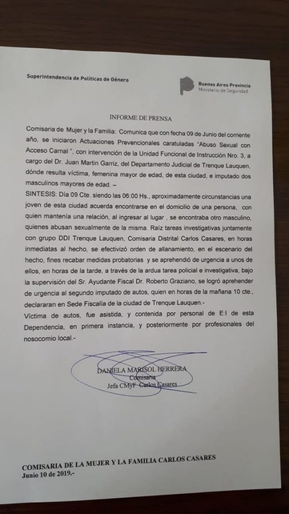La joven habría sufrido el abuso sexual en un domicilio y uno de los abusadores sería su pareja, en conjunto con otro hombre más. Ella habría llegado a la vivienda donde se encontraba su novio y allí la aguardaría una persona más. Posteriormente a lo sucedido, radicó la denuncia en la Comisaria de la Mujer y se libró un operativo que finalizó con la aprehensión de dos individuos. Mañana se les tomará declaración indagatoria en la ciudad de Trenque Lauquen.