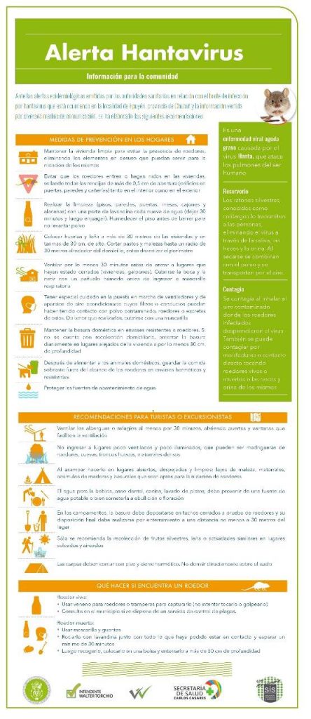“En carlos casares pertenecemos a la región sanitaria II, no estamos en alerta, pero si informamos de lo que sucede y que el ratón puede contagiar a cualquier persona, el virus se aloja en este vector y a través de la orina y materia fecal, deja partículas en el aire suspendidas que son inhaladas por el ser humano y lo infectan. Otras de las formas de contagio es a través de las mordeduras del ratón o lastimaduras en los humanos”, explicó la titular de APS.