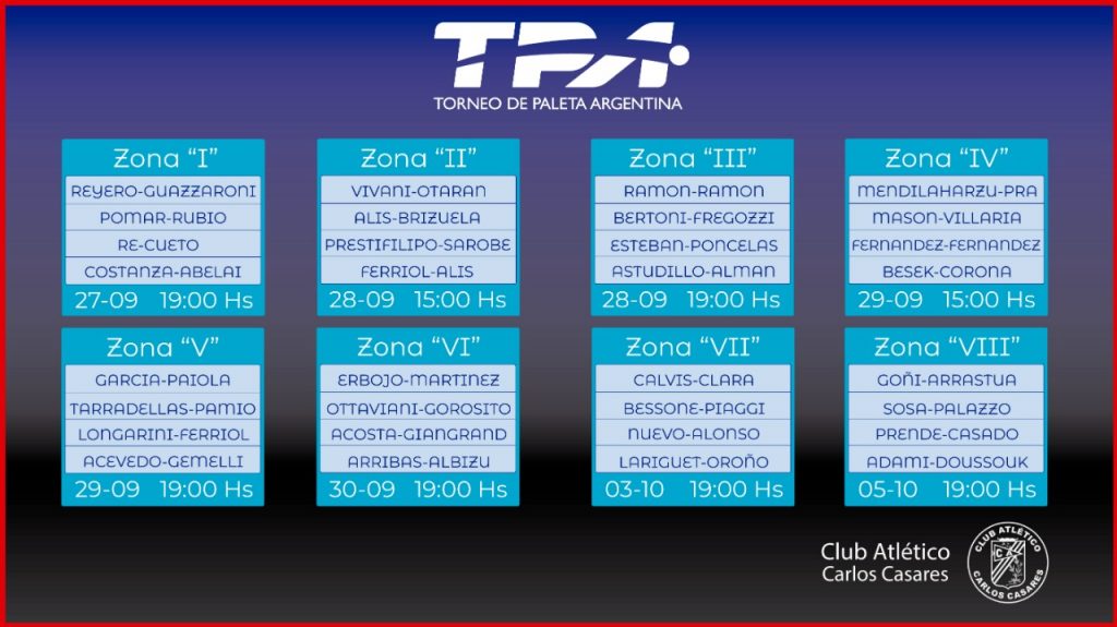 A las 21 horas en punto, como se había programado, en las instalaciones de la Sede del Club Atlético de Carlos Casares, durante 23 minutos y ante un gran marco de público, a través del sistema streaming se pudo observar en vivo el sorteo de cómo estará integrado el Torneo de Paleta Argentina que comenzará el próximo 27 de septiembre y que tendrá una Súper Final el 13 de Octubre.