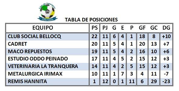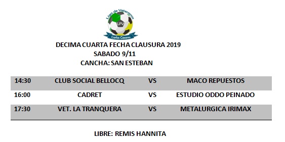 Este fin de semana se llevó a cabo la 13º fecha del Torneo de Veteranos Clausura 2019 «Octavio Gaute» en el predio de San Esteban. Hubo un gran triunfo de Veterinaria La Tranquera frente a Remis Hannita y dos empates entre Estudio Oddo Peinado y Metalúrigica Irimax y Cadre vs Bellocq.