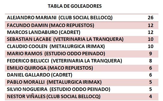 La Liga Casarense de Veteranos finalizó su etapa clasificatoria donde el equipo de Bellocq con la presencia del máximo goleador quedó en la primera posición con 29 unidades, seguidos por Metalúrgica Irimax que obtuvo 25 puntos y Maco Repuestos 22. Ahora comienza la etapa definitoria de los cuartos de final, recordemos que Bellocq pasó a semifinales directamente por haber obtenido el clasificatorio.
