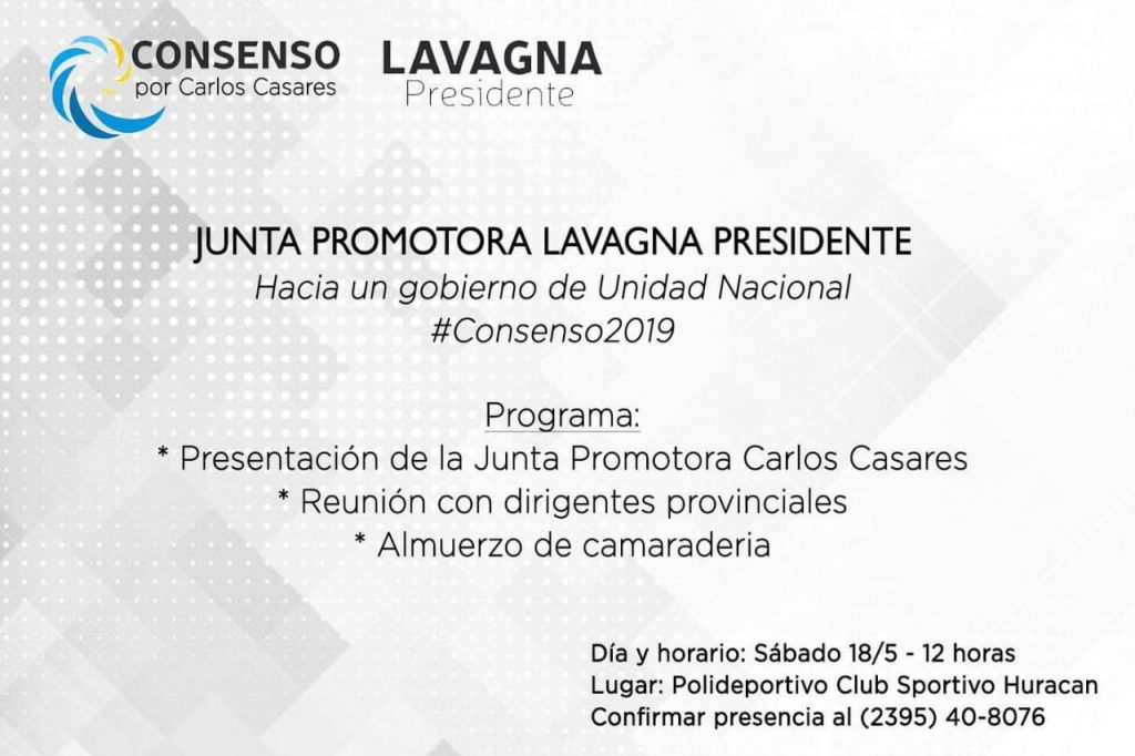 La presentación de la Junta Promotora “Lavagna Presidente” #Consenso2019 se realizará a las 12 horas en la Sede del Club Huracan. Luego se realizará una reunión con dirigentes seccionales y finalizará con un almuerzo.