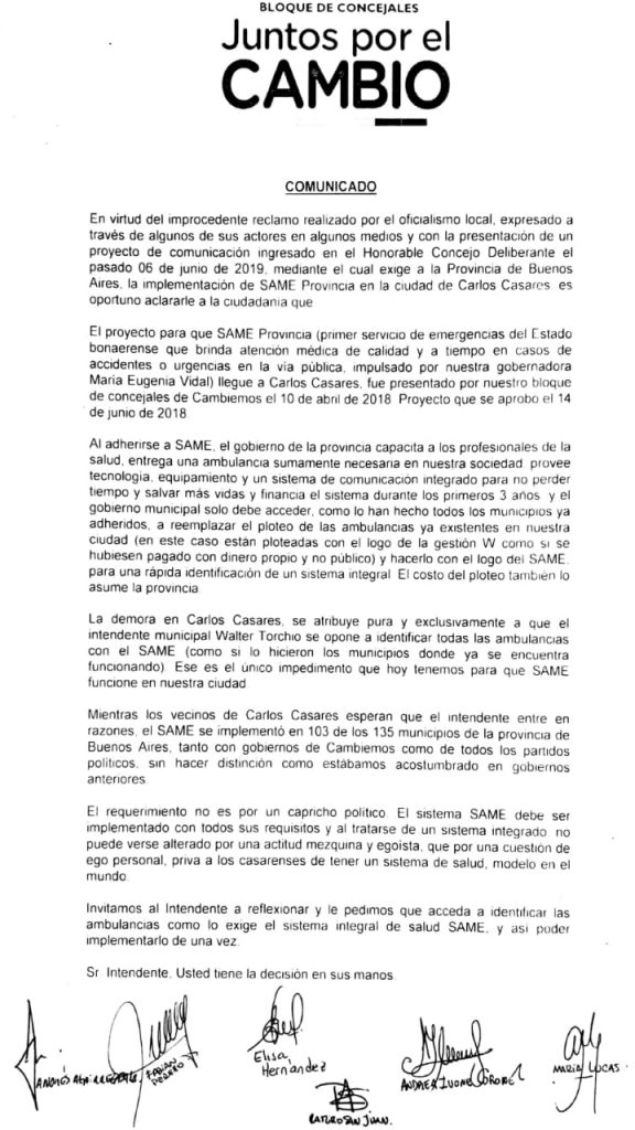 «La demora en nuestro Carlos Casares se atribuye pura y exclusivamente a que el intendente Walter Torchio se opone a identificar todas las ambulancias con el SAME. Ese es el único impedimento que hoy tenemos para que SAME funcione en nuestra ciudad», expresa el comunicado del bloque «Junto por el Cambio» publicado a continuación.