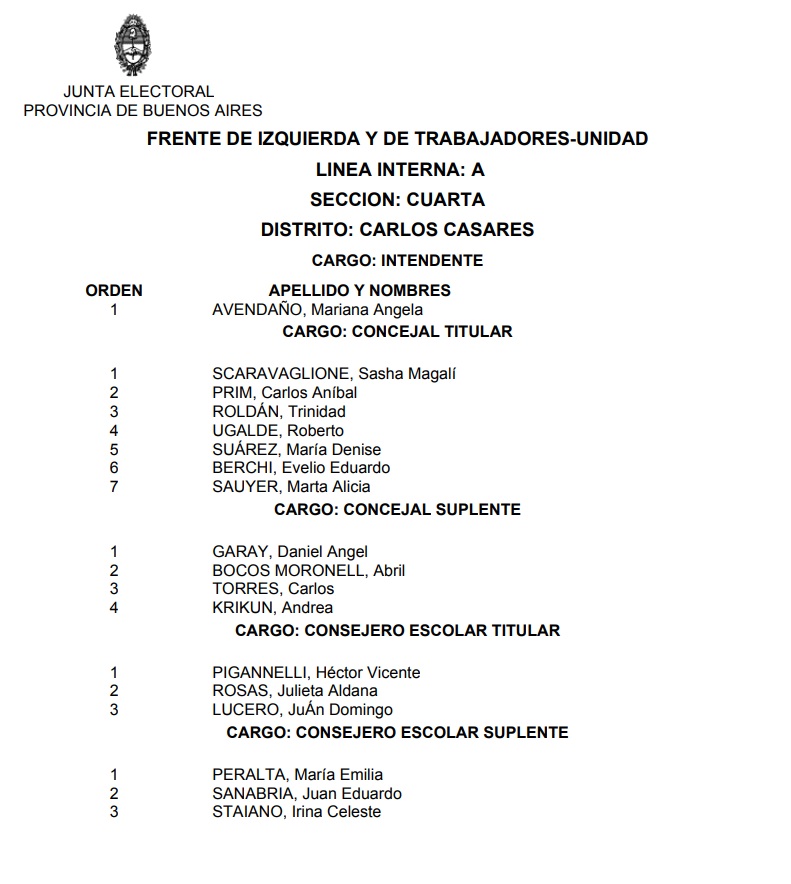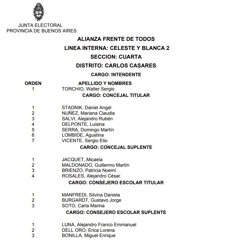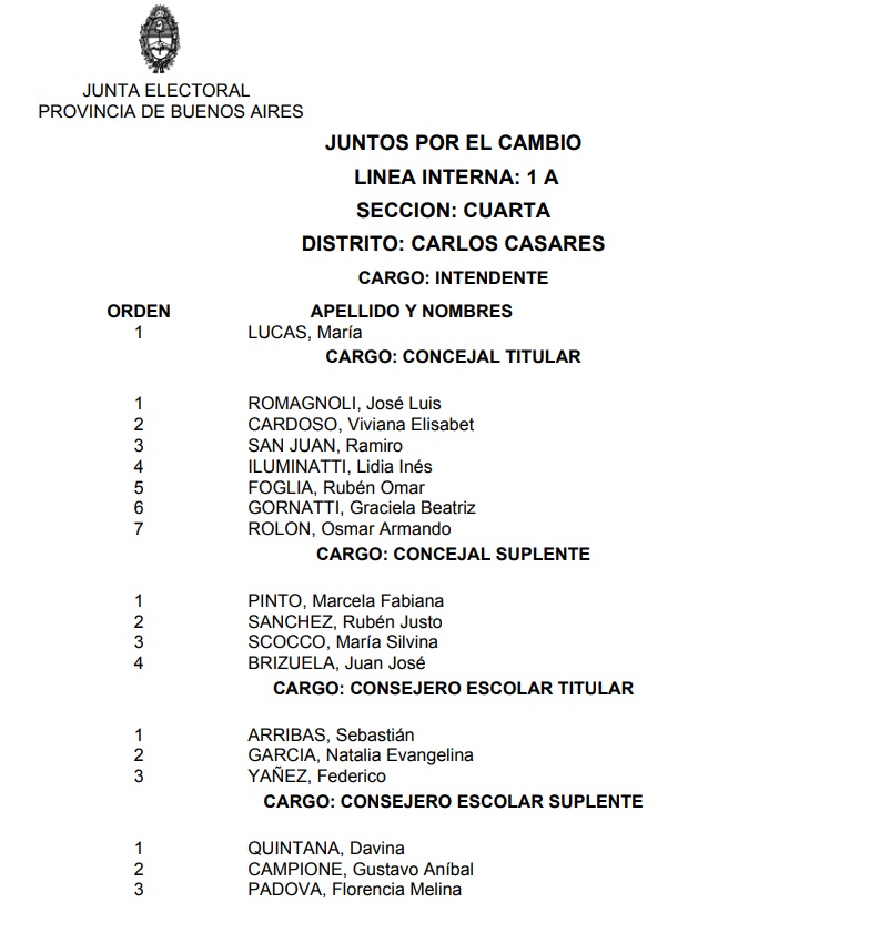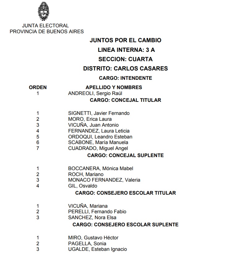 Portal El Toro accedió a la oficialización de las listas a través de la Junta Electoral de la Provincia de Buenos Aires que confirma la presencia de cuatro listas para las próximas elecciones Primarias, Abiertas, Simultáneas y Obligatorias en nuestra ciudad.