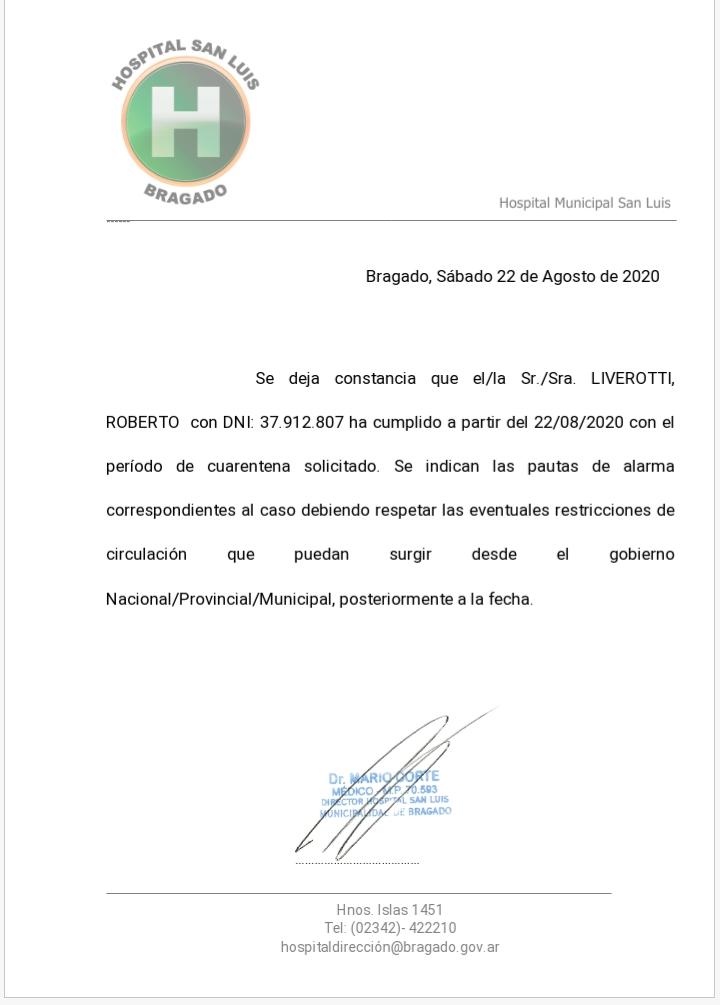 Días atrás habíamos informado desde Portal El Toro que el joven casarense de 26 años, Pio Liverotti había dado positivo de coronavirus en la ciudad de Bragado, donde reside desde hacer varios meses. Hoy confirmó a que ya fue dado de alta y ya se encuentra en optima condiciones «Ahora a cuidarse», expresó Pio, quien además dejó un consejo «un poquito de dolor de garganta y fiebre arriba de los 37 y medio y hay que llamar al doctor, para evitar contagiar a algún familiar».