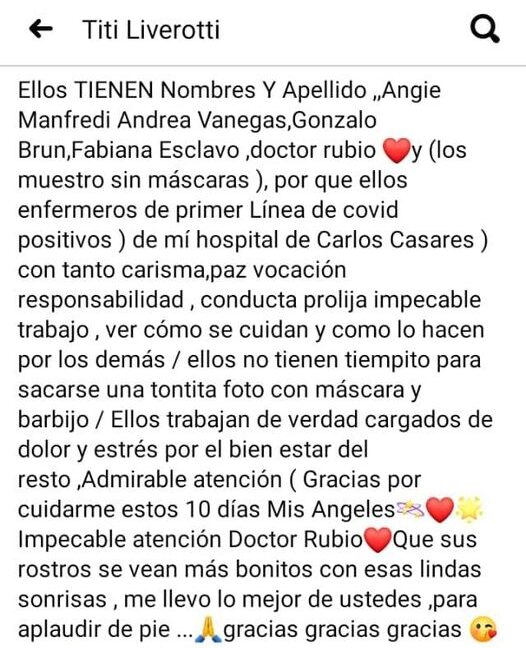 «Hoy fue un dia de mezcla de emoción, cansancio pero esto es lo que llena el alma como no seguir luchando contra esta maldita pandemia, ver salir a una compañera, guerrera y encontrarse con todo el personal de salud para recibirla fue lo mas lindo. Grande mi querida Titi esto no da mas fuerza para seguir luchando, fuerza que de esta salimos todos juntos mis compañeros de nuestro querido hospital. Fuerza mi amada ciudad Carlos Casares», expresó en su red social su compañera enfermera, Fabiana Esclavo.