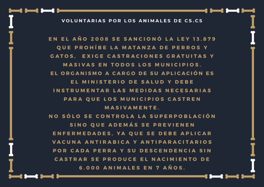 Gente de todos los municipios de la provincia de Buenos Aires desesperados por la reproducción de perros y gatos piden desde hace años que esta ley se cumpla y se castre masiva y gratuitamente antes del primer celo a machos y hembras , preñadas y en celo pero desde el gremio veterinario ponen trabas porque dicen que si los Municipios castren ellos pierden clientes y el gobierno parece que los escucha y limita el servicio