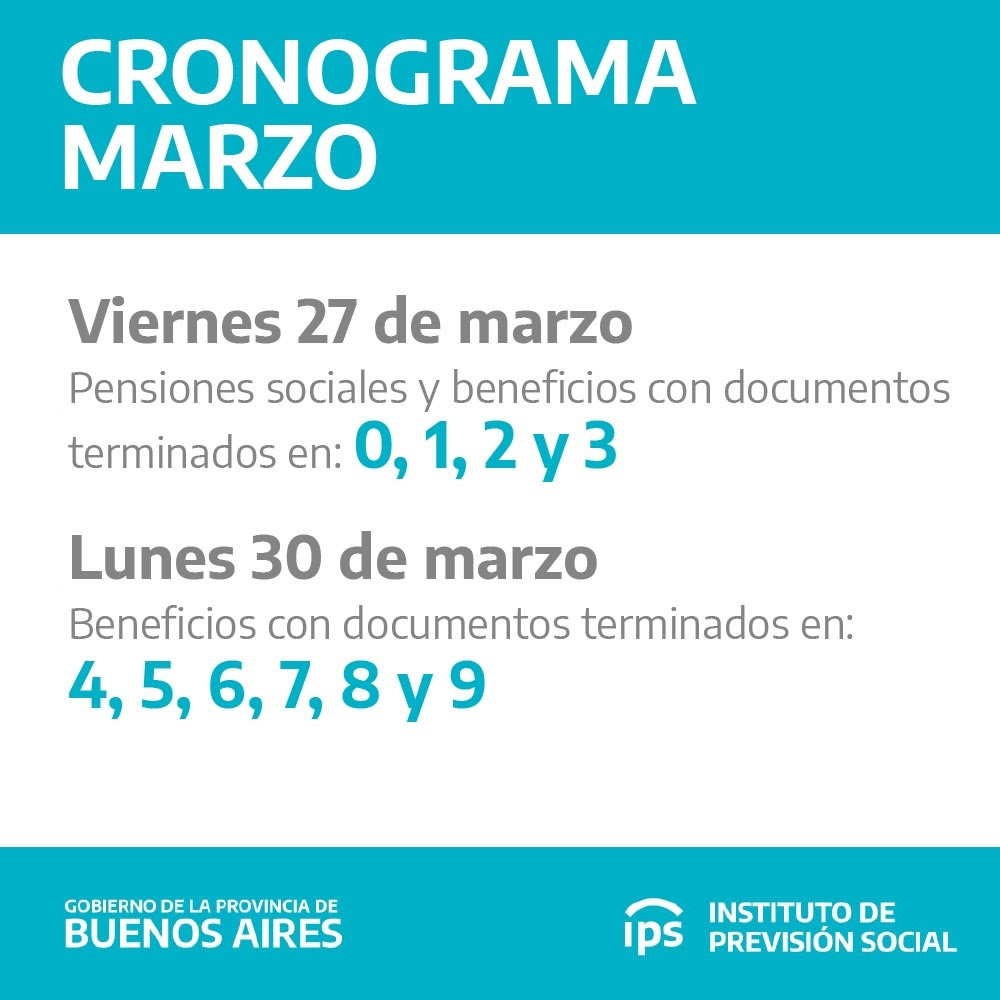 El Instituto de Previsión Social Bonaerense (IPS) informa que los jubilados y pensionados de la Provincia de Buenos Aires percibirán los haberes correspondientes al mes de marzo entre los días viernes 27 y lunes 30, según cronograma que se detalla a continuación: