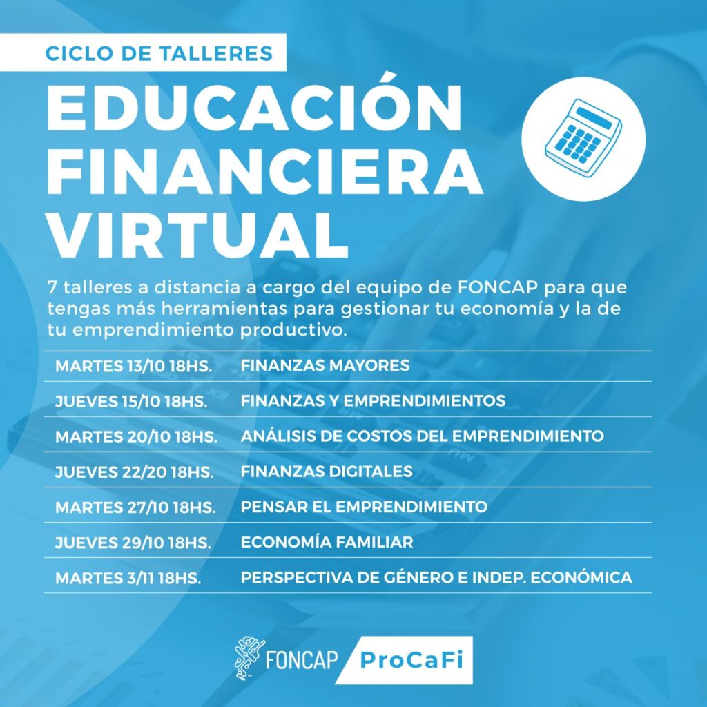 Desde la Subsecretaría de Industria, Comercio y Producción junto a la Oficina de Empleo de la municipalidad dejan abierta la invitación a participar de los siete talleres a distancia, a cargo del equipo de FONCAP (Fondo de Capital Social). EL objetivo es brindar más herramientas para gestionar la economía de la persona y la de su emprendimiento productivo.