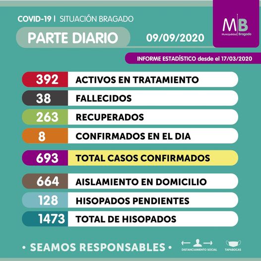 El estado de situación en la ciudad de Bragado parece ingresar en una meseta con contagios altos, con 8 positivos en el día de hoy, el número de activos es de 392, lleva 38 fallecidos, 693 es el total de positivos y 263 los recuperados. En el hospital hay 50 personas internadas, 12 de ellas a la espera del resultado. En UTI hay 4 pacientes, dos con asistencia respiratoria. Hoy recibieron el alta 16 personas y falleció un hombre de 77 años.