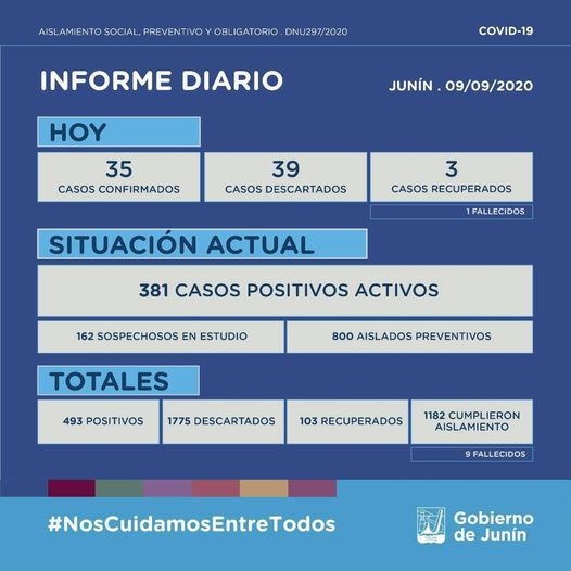 El municipio de Junín tiene 381 casos positivos activos, 168 sospechosos y 800 aislados preventivos. 493 es el total de positivos y 103 son los recuperados. Llevan 9 fallecidos y hoy hubo 35 nuevos positivos.