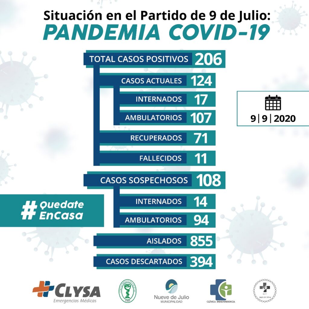 La ciudad de Nueve de Julio tiene 206 casos positivos, de los cuales 124 son activos, 107 ambulatorios y 17 internados, 71 recuprados y 11 fallecidos.