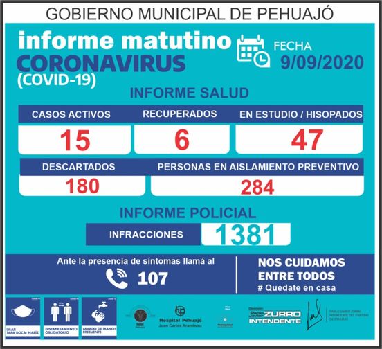 En tanto el municipio de Pehuajó cuenta con 15 positivos activos en la actualidad, 6 recuperados, 47 hisopados en espera y 284 en aislamiento.
