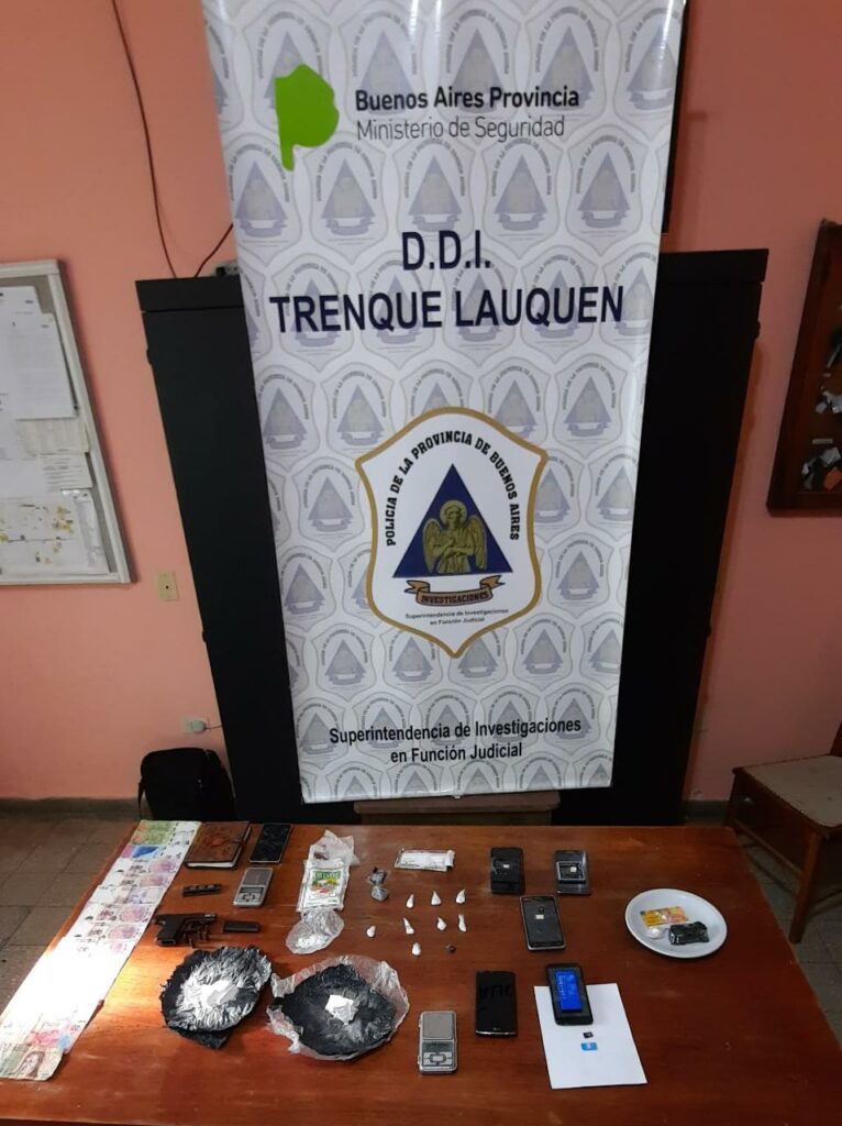 HECHO: Policías de la DDI de Trenque Lauquen, investigando una causa por comercialización y traslado de estupefacientes, desde fines del año pasado, el día jueves en horas de la tarde desplegó un amplio operativo en la región oeste de la Provincia para ejecutar Órdenes de Allanamiento e Interceptaciones sobre Ruta Nacional Nro. 05, expedidas por el Juez Federal de Junín Dr. Pedro Plou y Fiscalía Federal de Pehuajó a cargo Dra. María Cecilia Mc Intosh, con resultados altamente satisfactorios en lo que respecta al secuestro de Clorhidrato de Cocaína compactado y también fraccionado para su comercialización, arma de fuego, vehículo VW Gol se movilizaban los malvivientes, dinero, balanzas de precisión, sustancias de corte.