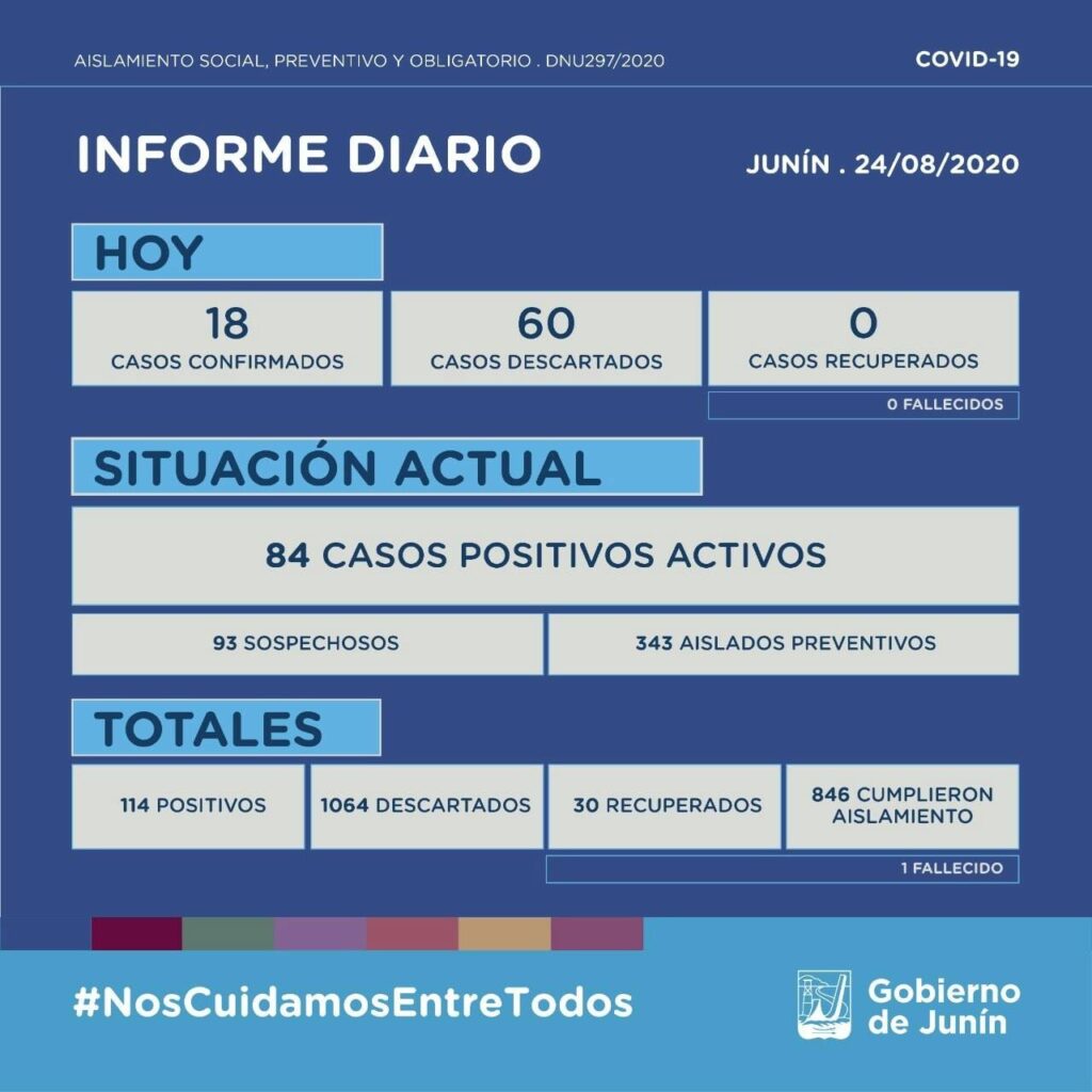 Además de los 18 casos de COVID positivo, este lunes una persona no residente (Alberti) recibió el alta.