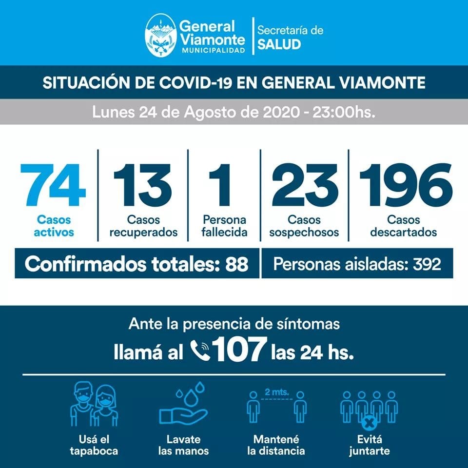 En las últimas horas Falleció una vecina de general Viamonte, tiene 73 casos positivos activos en la actualidad, confirmados totales 88, 13 recuperados y 392 personas aisladas.