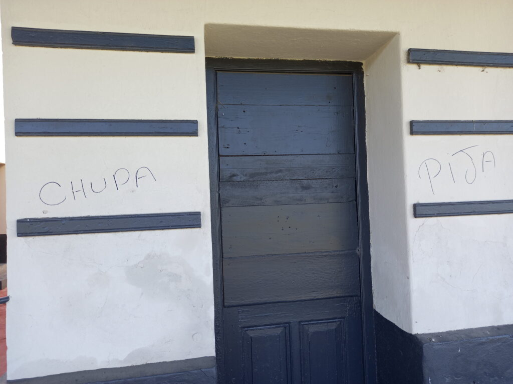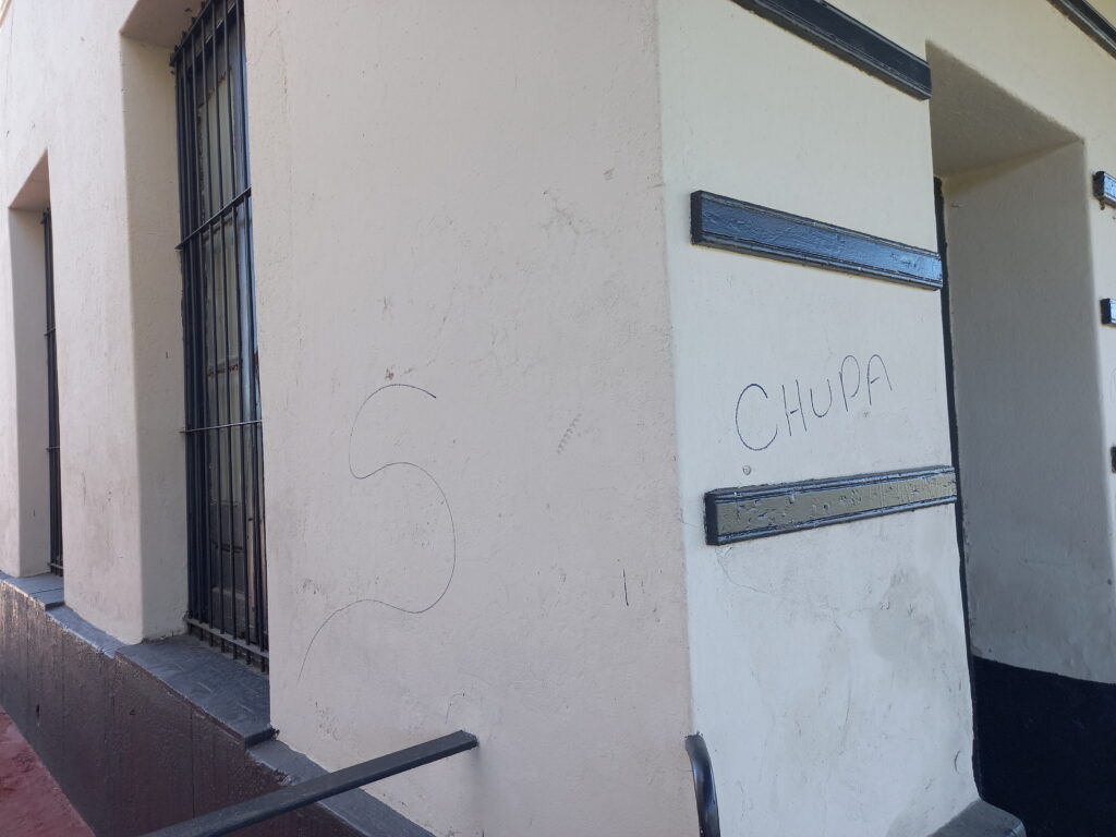 Días atrás dañaron las paredes recientemente pintadas de la estación de tren con imágenes obsenas. Desde el Ministerio de Transporte de la Nación comenzaron hace unos meses la restauración de la estación y las vías para la pronto retorno del servicio.