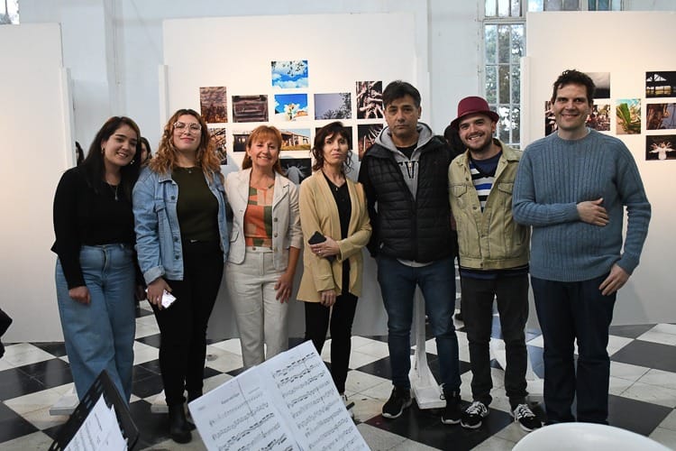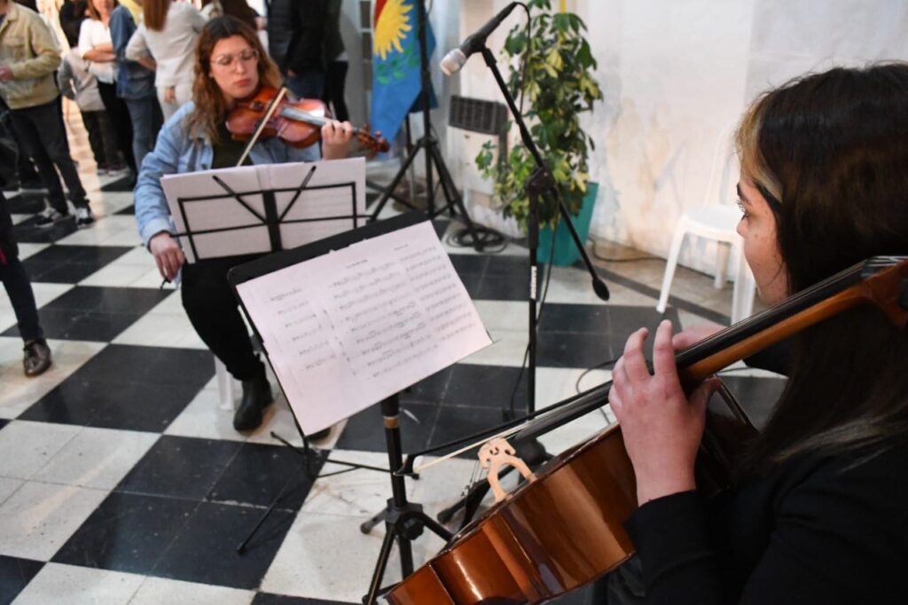 Las alumnas de la Orquesta Escuela Ludmila Tarascio y Aldana Serafini hicieron una intervención musical mientras transcurría la exposición de arte.