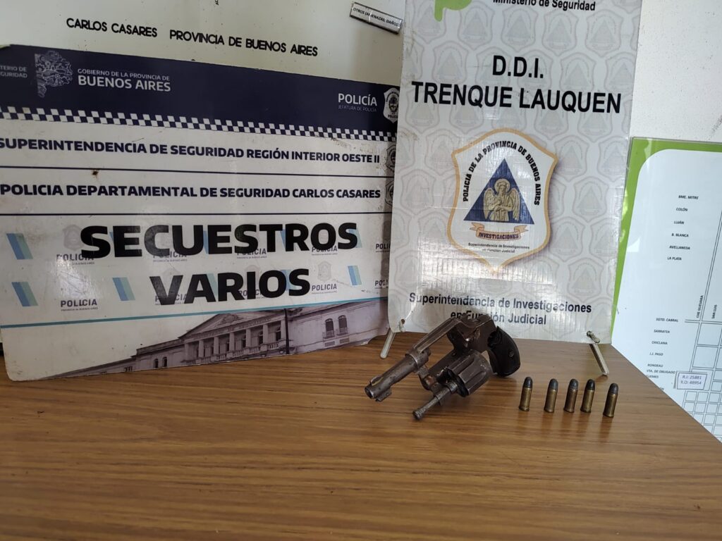 En el marco de las actuaciones judiciales a Cesar Carmona, se continuaron con las tareas investigativas por parte de personal policial de la Comisaría de Carlos Casares y del grupo de la DDI local, consistente en recolección de testimonios, análisis de cámaras de Video vigilancia publicas en Acceso Espil y Julio F. Ramos, procediendo a la incautación de un Arma de Fuego calibre 32 , con cinco cartuchos, colocados en tambor cargador aptos para el disparos, que descarto el aprehendido en el interior de una boca tormenta, momentos antes a su aprehensión.