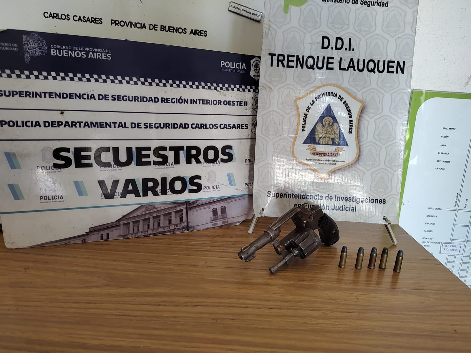 En el marco de las actuaciones judiciales a Cesar Carmona, se continuaron con las tareas investigativas por parte de personal policial de la Comisaría de Carlos Casares y del grupo de la DDI local, consistente en recolección de testimonios, análisis de cámaras de Video vigilancia publicas en Acceso Espil y Julio F. Ramos, procediendo a la incautación de un Arma de Fuego calibre 32 , con cinco cartuchos, colocados en tambor cargador aptos para el disparos, que descarto el aprehendido en el interior de una boca tormenta, momentos antes a su aprehensión.