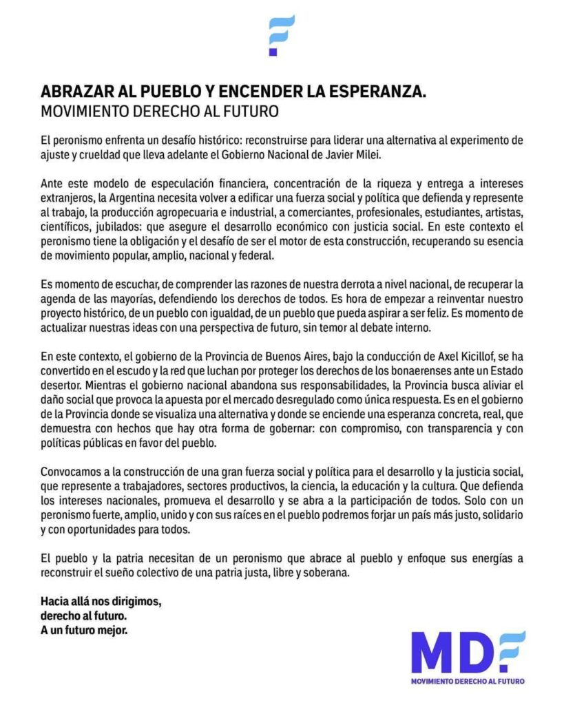 Este último sábado, el gobernador de la provincia lanzó su nuevo espacio político denominado «Movimiento Derecho Al Futuro» que recibió el apoyo de más de 40 intendentes peronistas de la provincia de Buenos Aires y también de un centenar de organizaciones sociales, sindicatos y Organizaciones civiles.