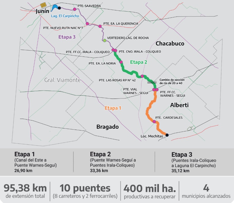 El Tramo V constituye el segmento final del Plan Maestro Integral, con una extensión total de 95,38 kilómetros, organizado en tres etapas entre el Canal del Este de la laguna de Bragado y la laguna El Carpincho, en Junín.