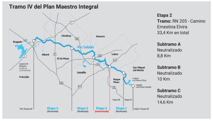 Las intervenciones en las etapas 1 y 2 del Tramo V se extienden desde Bragado hasta aguas abajo de la laguna Rocha, sobre una longitud total de 60,26 kilómetros, atravesando los partidos de Alberti, Bragado y Chacabuco.