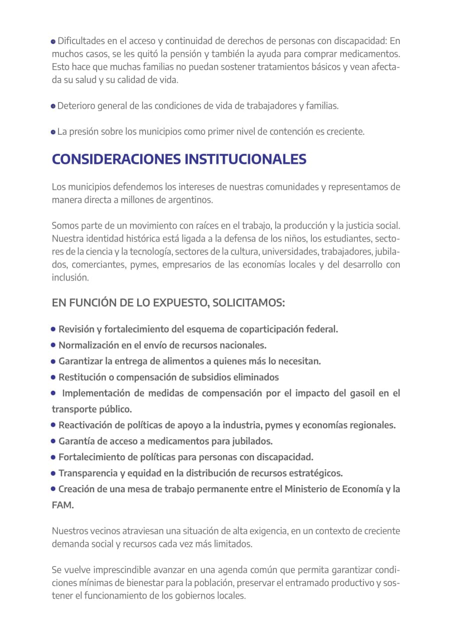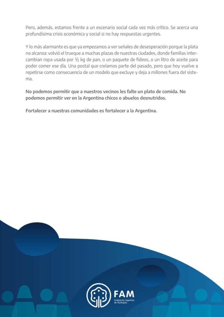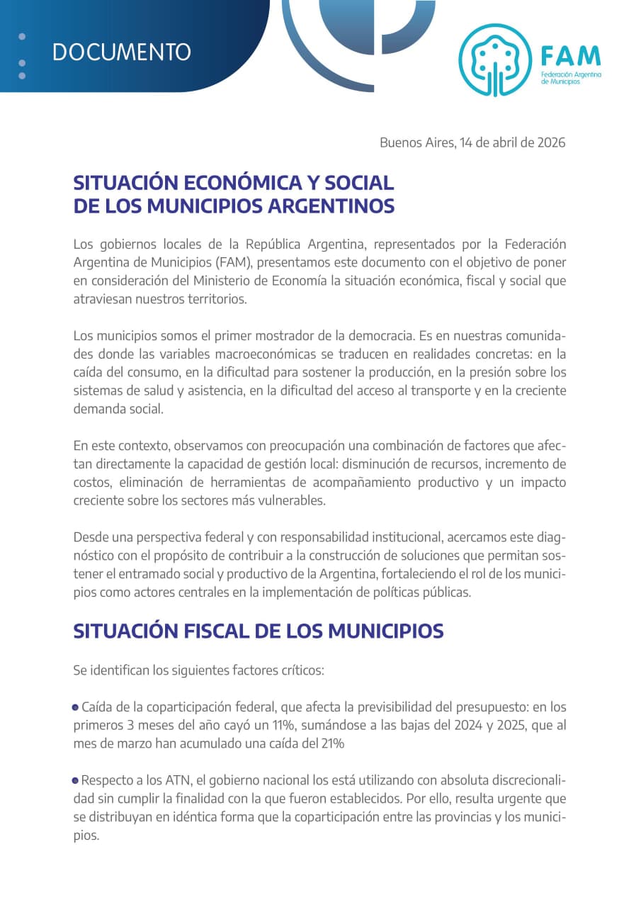 Los municipios de todo el país, nucleados en la Federación Argentina de Municipios, elevaron un documento al Gobierno Nacional en el que advierten sobre la delicada situación económica y social que atraviesan las comunidades locales.